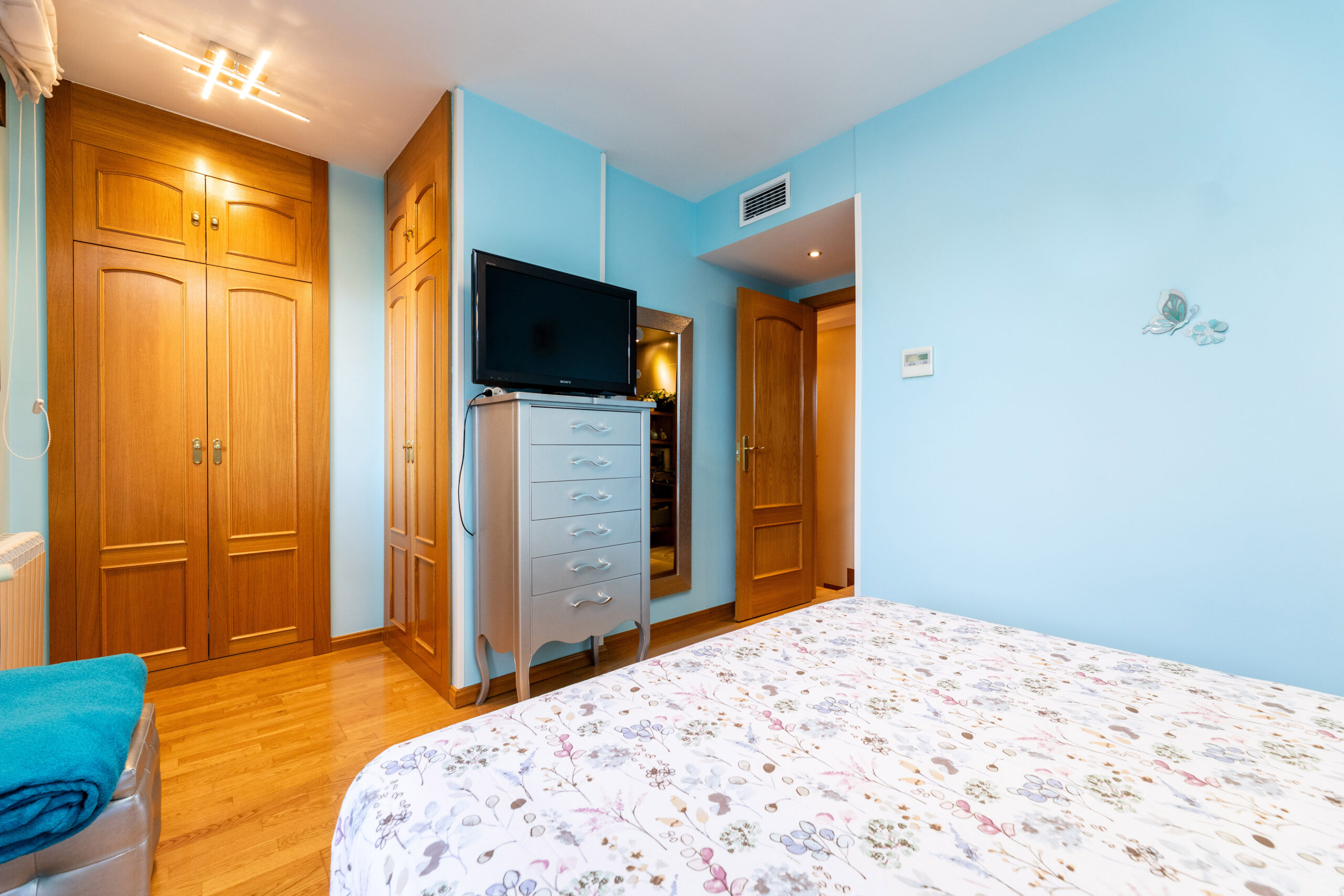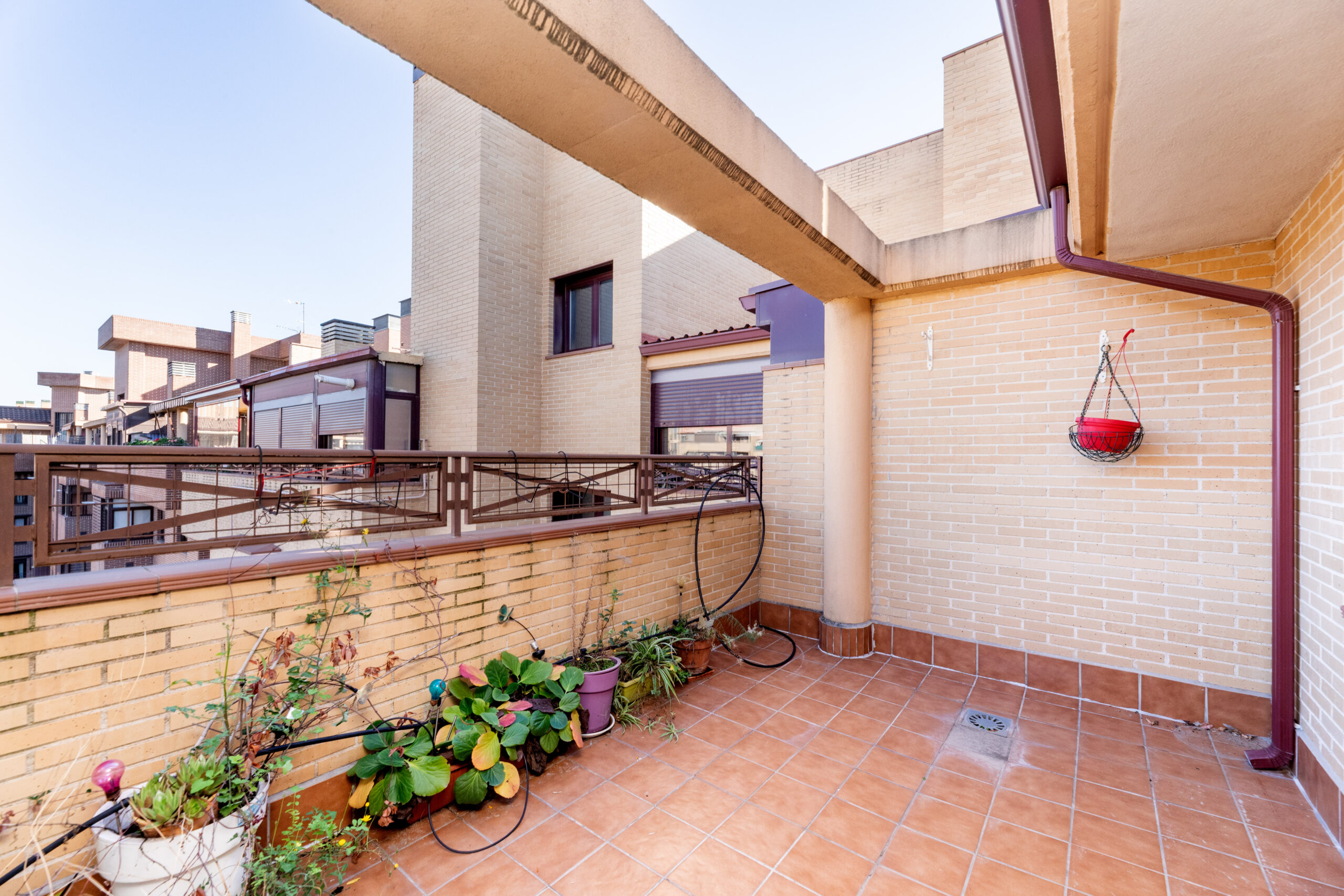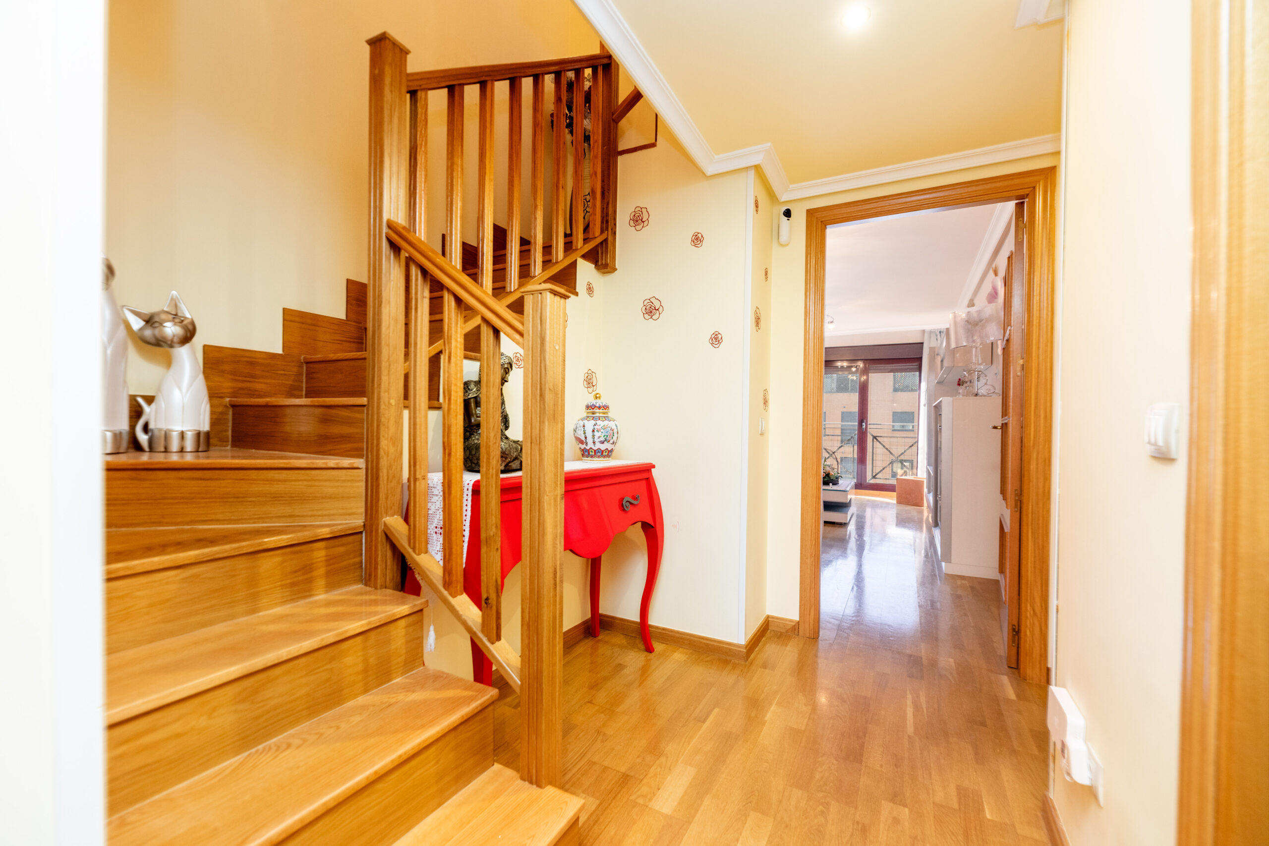 Subiendo a la segunda planta, encontramos otros dos dormitorios dobles, uno de ellos con vestidor, y ambos con terrazas independientes. Una de las terrazas está orientada al sur, disfrutando de sol durante casi todo el día; la otra, orientada al norte, ofrece un ambiente más fresco, ideal para leer, entrenar o relajarse.