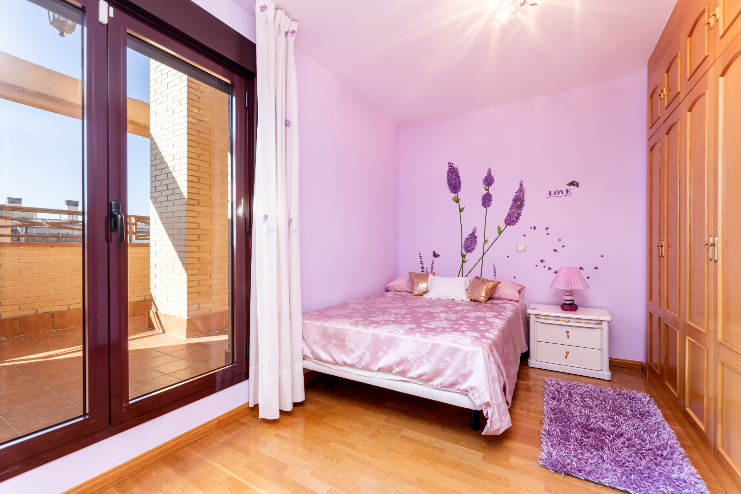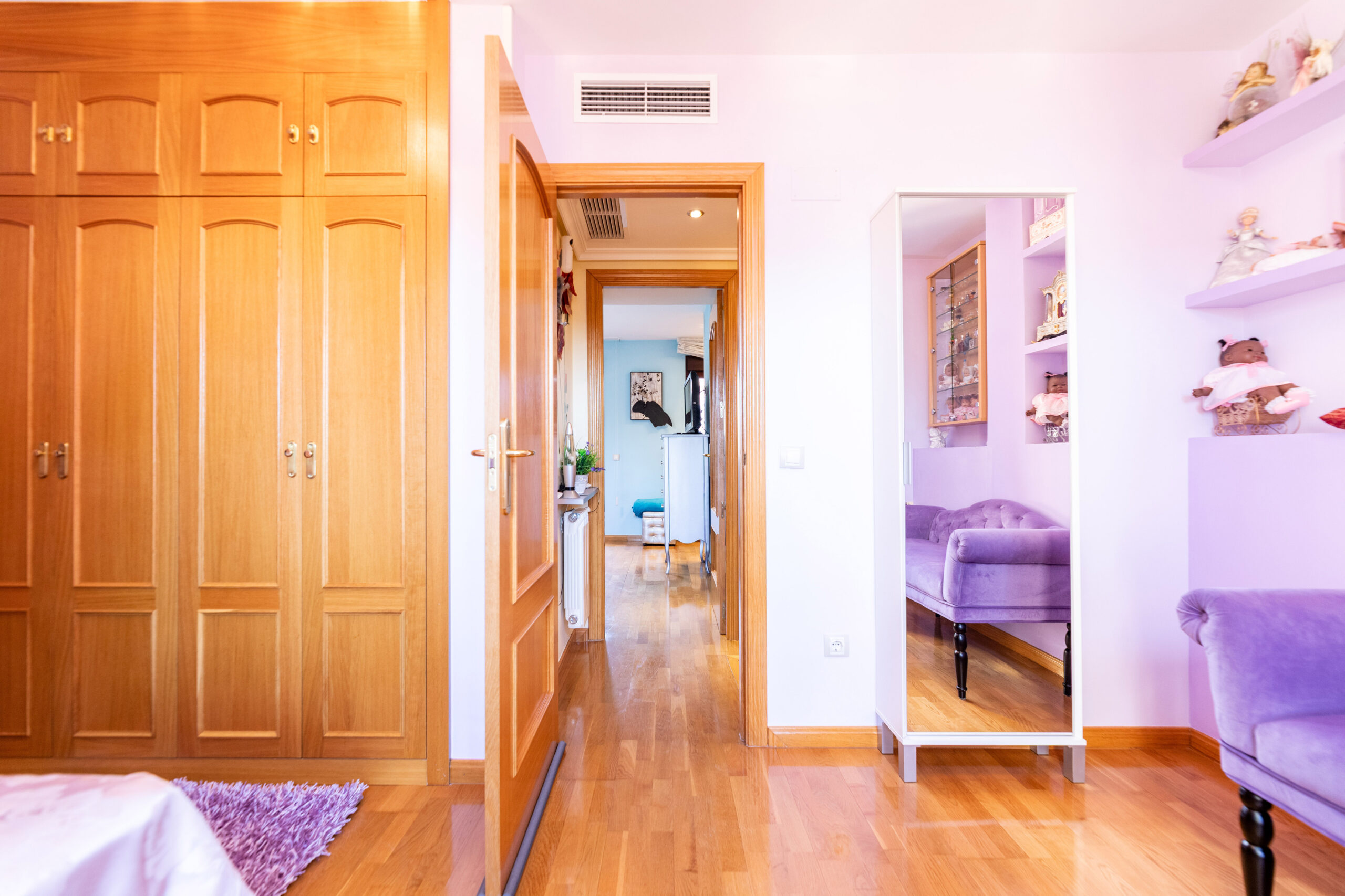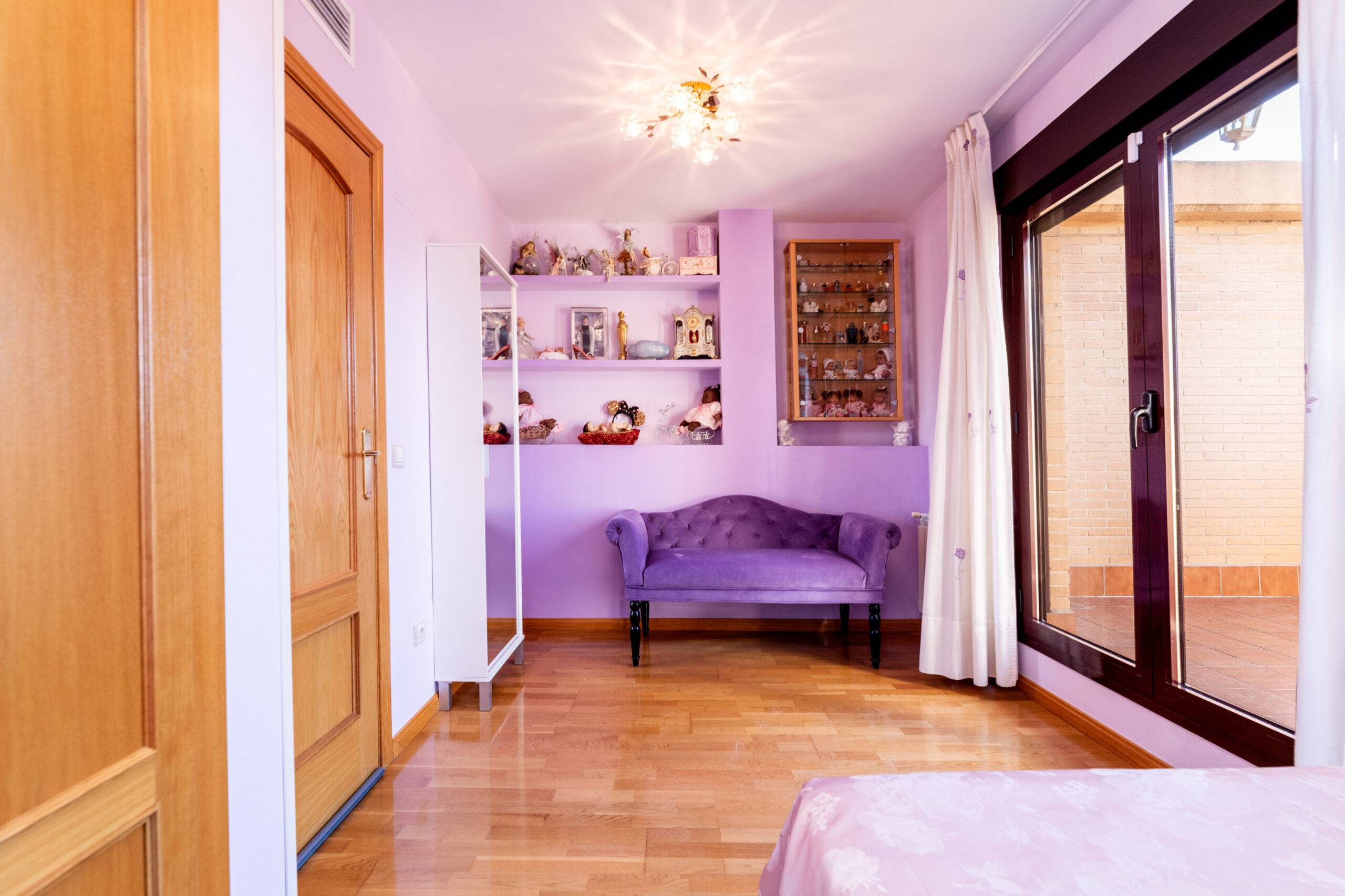 Subiendo a la segunda planta, encontramos otros dos dormitorios dobles, uno de ellos con vestidor, y ambos con terrazas independientes. Una de las terrazas está orientada al sur, disfrutando de sol durante casi todo el día; la otra, orientada al norte, ofrece un ambiente más fresco, ideal para leer, entrenar o relajarse.